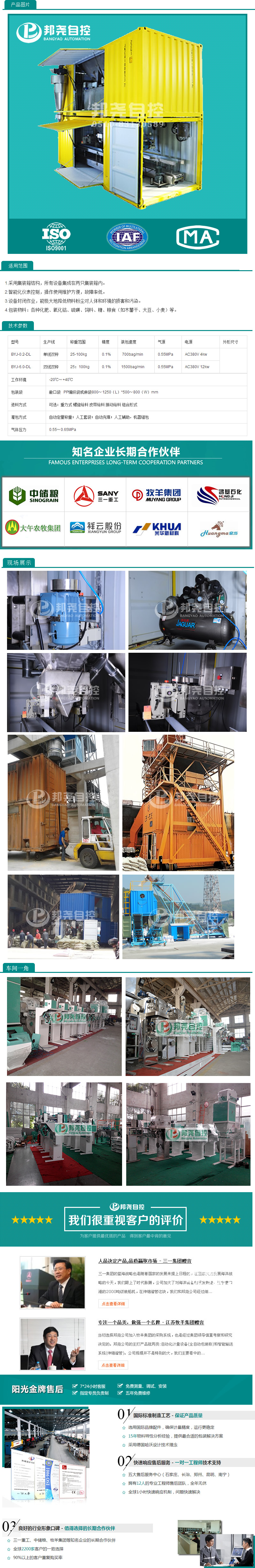 采用集裝箱結構,所有設備集成在兩只集裝箱內。 智能化儀表控制,操作使用維護方便,故障率低。 設備封閉作業,能極大地降低物料粉塵對人體和環境的損害和污染。